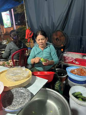 Vừa trò chuyện với chúng tôi, bà Đông vừa thoăn thoắt gọt dưa leo cho vào đĩa. Bên cạnh, bà Linh, người làm thuê cho bà Đông đã nhiều năm tay cũng liên tục đổ bánh vào chảo, chín thì vớt ra cho ráo mỡ để cho vào đĩa. Vừa làm cô Linh vừa tâm sự:"Tôi làm từ 2019 đến giờ. Nói chung quán cô Đông bình dân, giản dị, bánh đổ ngon, nước mắm pha ngon, người ta thích ăn”.