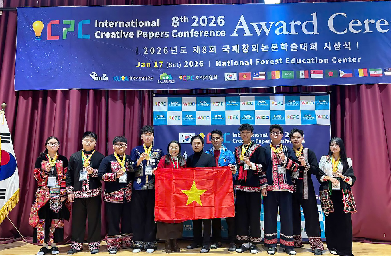Đoàn học sinh Trường Phổ thông Vùng cao Việt Bắc vừa xác lập thành tích ấn tượng tại Cuộc thi Khoa học Kỹ thuật Olympic và Hội thảo Quốc tế ICPC 2026 (International Creative Papers Conference) lần thứ VIII, được tổ chức tại Hàn Quốc bởi Hiệp hội Phát minh Đại học Hàn Quốc (KUIA).