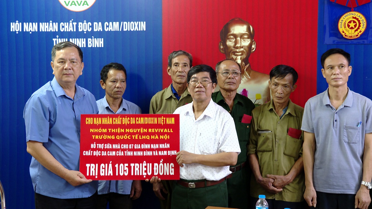 Dịp này, Nhóm thiện nguyện RevivAll của các học sinh Trường quốc tế Liên hợp quốc - Hà Nội (UNIS) trao tặng 45 triệu đồng để sửa chữa nhà cho 3 gia đình nạn nhân chất độc da cam trên địa bàn tỉnh Ninh Bình.