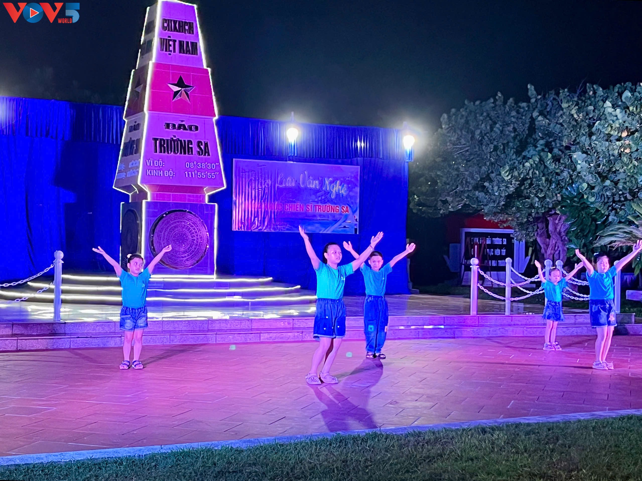 Thiếu nhi đảo Trướng Sa biểu diễn văn nghệ trước cột mốc chủ quyền. Ảnh: Lan Phương.