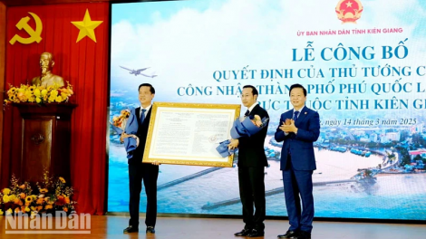 (VOVWORLD) - 坚江省富国市人民委员会3月14日举行仪式,公布政府总理关于公认富国市为坚江省直辖一级都市的决定。