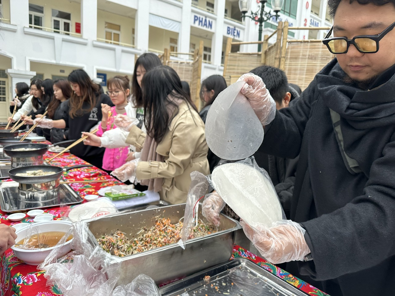 越南春节传统菜肴烹饪体验区吸引了大批留学生。在这里,学生们将学习如何包粽子和春卷,如何做越南春节大菜。来自中国湖南省的留学生钱旭峰表示,他吃过传统的越南春卷,今天能亲手做,觉得很有趣。对他来说,越南春节既熟悉又新鲜。钱旭峰:“越南的春节和我们的也差不多,但是呢它又有一些其他的区别,就感觉不一样,风俗习惯感觉有一点点差别,很有意思。”