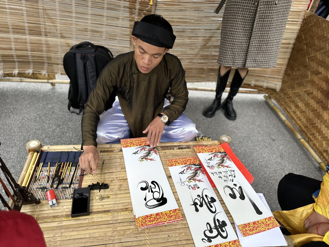 参加越南春节活动,除了热闹的的舞狮舞龙表演,留学生们还可以体验捏面塑、写书法、摆五果盘、包粽子、参加并体验竹竿舞、拔河等越南民间游戏。中国留学生黎俊达分享说,越南的春节非常热闹,大家都很开心、热情,营造出友好的氛围,让大家很快就打成一片。黎俊达还分享说,他非常喜欢越南书法,因为其笔画柔和、又有力量感。 黎俊达表示:“我觉得越南的书法挺不错的,它就有独领风骚,独树一帜的那种感觉,很特别。在我见过的多种书法中,它是有一点中西结合的感觉,特别好,就很流畅、行云流水。”