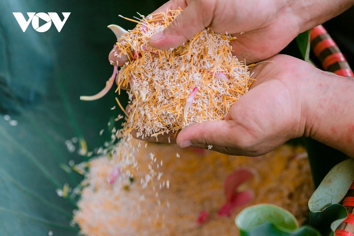 荷花茶窨制方法一般有两种。快窨的话,茶艺师就把茶叶直接塞进花里,用绳子绑住花瓣。花继续插在水中保鲜。几个小时后拿出来,切掉花茎,花朵进行减压包装,放进冰箱保管。这种茶按朵卖,每朵8万越盾(约合3.4美元),一朵能泡一壶茶。 |
