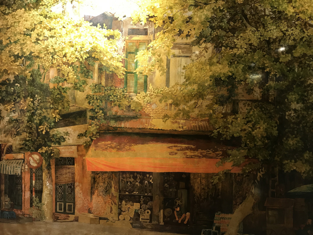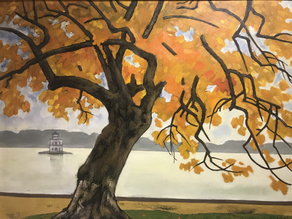 以丝绸、油漆、磨漆为主材料,通过生动的构图和精巧的艺术手法,艺术家们描绘了美丽迷人的河内秋天的景色和空间:从秋日的熟悉街角、落满黄叶的路、夏末的荷花、湖边深秋的早晨、到古屋棕色砖瓦屋顶上折射的金秋阳光等。