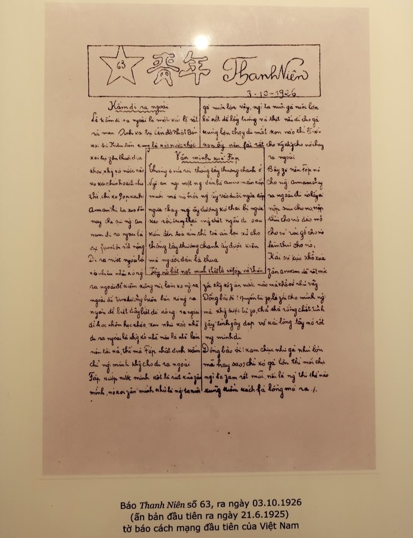 1926年10月3日出版的第63期《青年报》是越南领袖阮爱国在中国出版的第一份革命报纸,以在20世纪30年代初为祖国和其他地方做好政治思想和组织准备以成立无产阶级的政党。