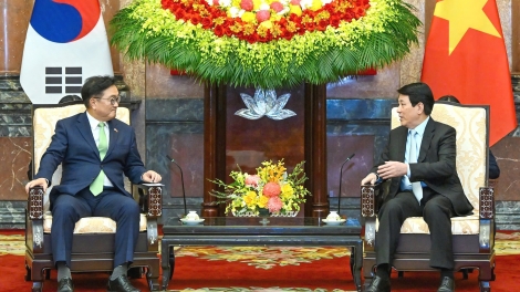 (VOVWORLD) - 21日午後、国家主席府でルオン・クオン国家主席は、チャン・タイン・マン国会議長の招待を受けてベトナムを公式訪問中の韓国の禹元植(ウ・ウォンシク)国会議長と会見しました。