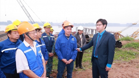 (VOVWORLD) - 14日、ハノイ労働連盟のグエン・バン・タン議長は、バンフック橋およびトゥオンカット橋の建設現場を訪れ、工事に従事する労働者を激励し、贈り物を手渡しました。