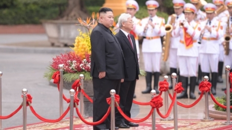 (VOVWORLD) - 既にお伝えしましたように、グエン・フ・チョン党書記長・国家主席の招きに応じて、朝鮮民主主義人民共和国の金正恩朝鮮労働党委員長は3月1日と2日の両日、ベトナム公式友好訪問を行いました。1日、国家主席府で、金委員長の歓迎式典が盛大に行われました。この写真記事で、これをご紹介します。