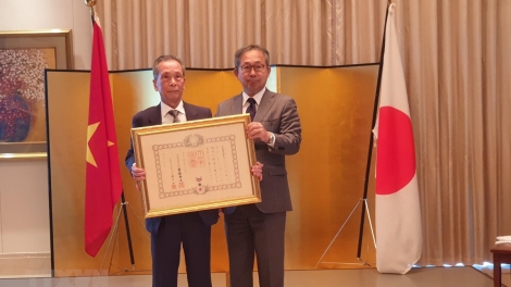 (VOVWORLD) - 17日午後、在ベトナム日本大使館の山田・滝雄大使はハノイ貿易大学日本語学科の元科長であるチャン・ソン教授に旭日小綬章を授与しました。