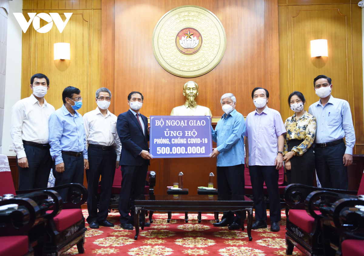 4日、ハノイで、ブイ・タン・ソン外相は、ベトナム祖国戦線中央委員会幹部会のド・バン・チエン議長に新型コロナ予防対策への義捐金として5億ドン、約238万円を手渡しました。