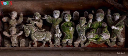 その一方で、神社の中に飾られていあるレリーフや対句、彫刻などは、村に因んだ物語りのようです。例えば、バクニン省にある17世紀に建立されたジエム神社です。この神社の本殿で際立つのは、龍、雲、花などの細かい彫刻です。あるいは、農民たちの日常生活を表現する彫刻も自然に施されていています。それぞれの彫刻は、王様の権威を示すものであったり、農民たちの豊作祈願を表しています。村の建築を研究しているディン・テェン・ハイ画家は次のように明らかにしました。