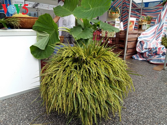 「コム作りの原材料は、主に若いもち米のネップ・カイ・ホア・バンです。ホン河デルタ地方のバクニン省や北部のバクザン省などで収穫されたものです。メーチー村のコムは、つくと薄くなって、いい香りと粘りのある食感が楽しめます。見た目も食用の青い色素を全く使わずに、コメそのものの青色を生かしています。」