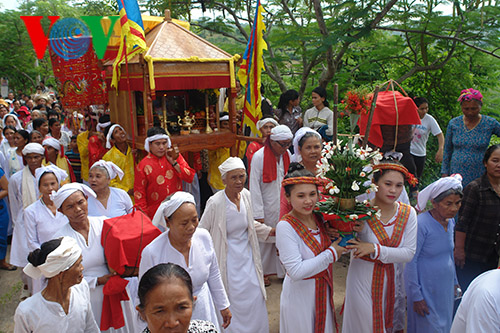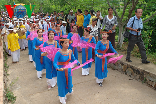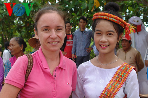 祭 りの間に、地元に住むチャム族をはじめ、各民族の人々は綺麗な伝統衣装を着用して、それぞれの家を訪れ、お祝いの言葉を交わします。どの居住地でも、音楽 や太鼓の音、民間遊戯、文芸公演など様々な活動が行われました。チャム族の一人ハン・ティ・レさんは次のように語っています。