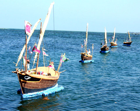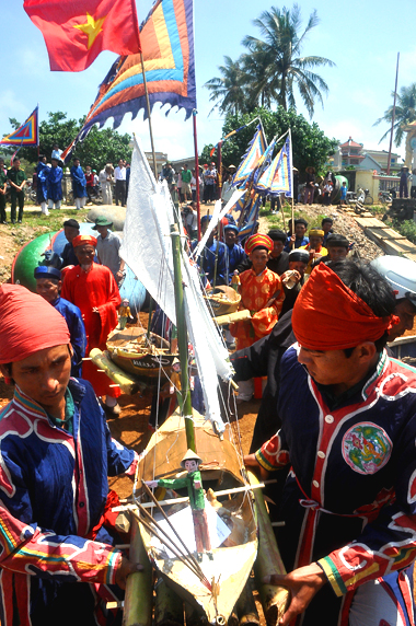 儀式が行われる期間中、リー・ソン島の住民は数百年前に使われていた船を模した小船を海に流します。小船の中にはホァンサ群島に出向いた兵士を模した人形やその所持品が乗せられます。リー・ソン島の住民は人形がその人の身代わりになると考え、ホァンサ群島に出向いた兵士を激励するとともに、安心感を与えるよう、人形を供養したのです。ビン・アン村に住むレ・ズさんは次のように話しました。(テープ)