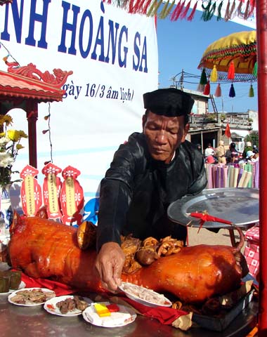「島民はホァンサ群島の主権保護のために犠牲となった兵士たちの冥福を祈る儀式を共同で催します。また、旧暦の3月15日にはぞれぞれの家庭で同様の儀式を行います。私は供養物の購入を担当します。儀式に使われる供養物には小船、兵士を模した人形、生きた豚や鶏が含まれます。」