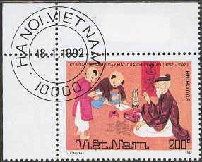 また、図案トラブルの切手も値打ちがでます。ベトナムの著名な教育者であったチュウ・バン・アン(Chu Van An、1292-1370)の生誕700年を記念して発行されたものです。この切手は、メガネをかけているチュウ・バン・アン教師が描かれていますがその時代には、メガネはありませんでした。