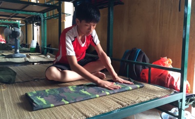 毎朝5時半、起床を知らせるゴングの音と伴に、全ての生徒は一斉に起きます。蚊帳や布団をたたみ、きちんと並び、庭へ出て、体操を始めます。生徒たちは一日中、部隊の生活に従わなければなりません。食事の時間が来ると、椅子を食堂へ持っていきます。食後、茶碗などを綺麗に片付けます。そして、訓練の準備をします。生徒らにとって参加当初の訓練はかなり困難でした。中学生のグェン・ドク・フィさんは一人っ子のため家では家族全員が甘やかしています。しかし、部隊の生活体験に参加してから、フィさんは部隊兵士のように上の規定を守らなければなりませんでした。洗濯も自分でしなければなりません。ゲーム遊びも禁止、携帯電話をも使用してはいけませんでした。当初、厳しい規定に慣れないため、フィさんは泣くばかりで、家に帰りたかったです。しかし、4日後、周りの人々の励みを受けたフィさんは段々面白くなてっきました。