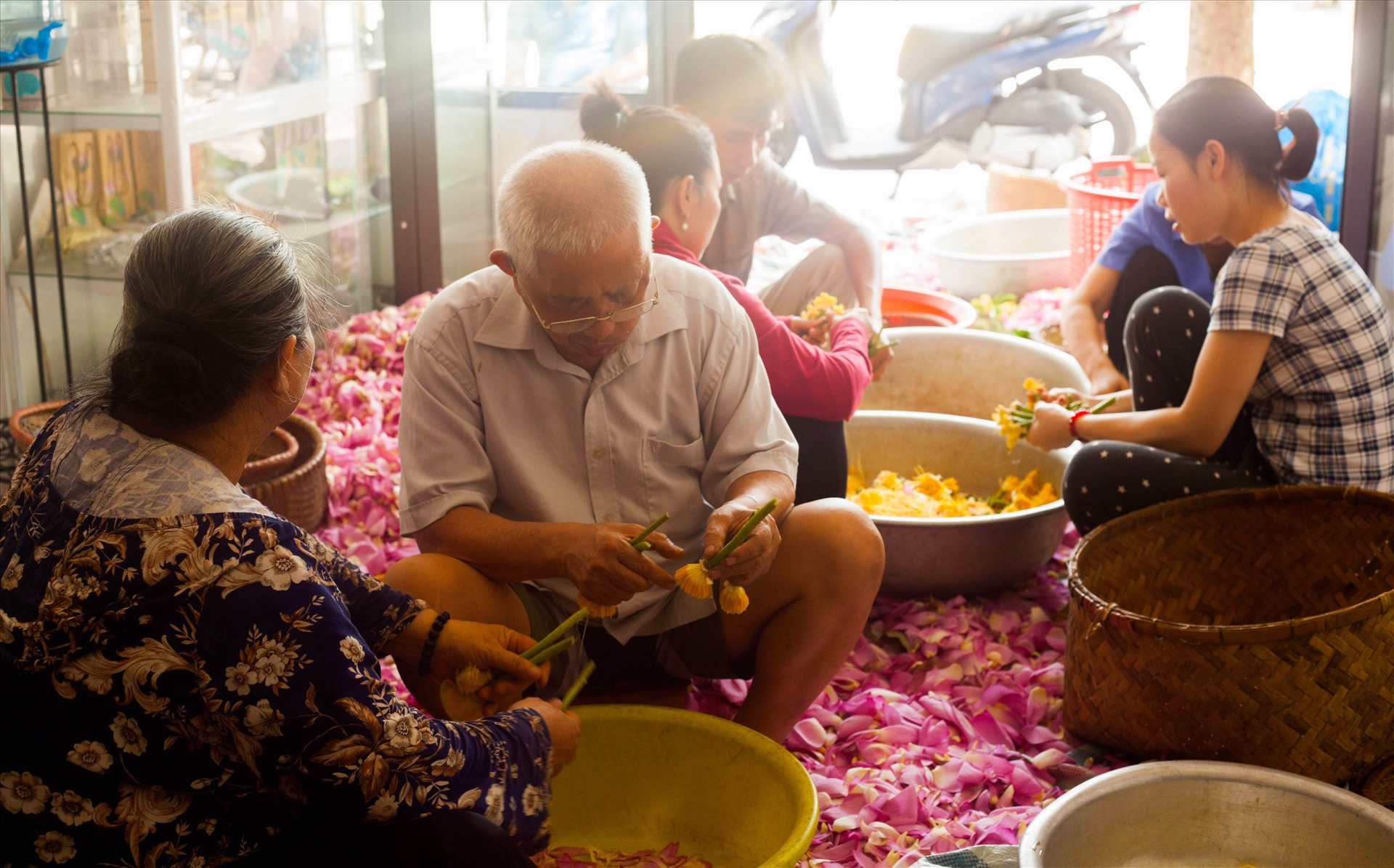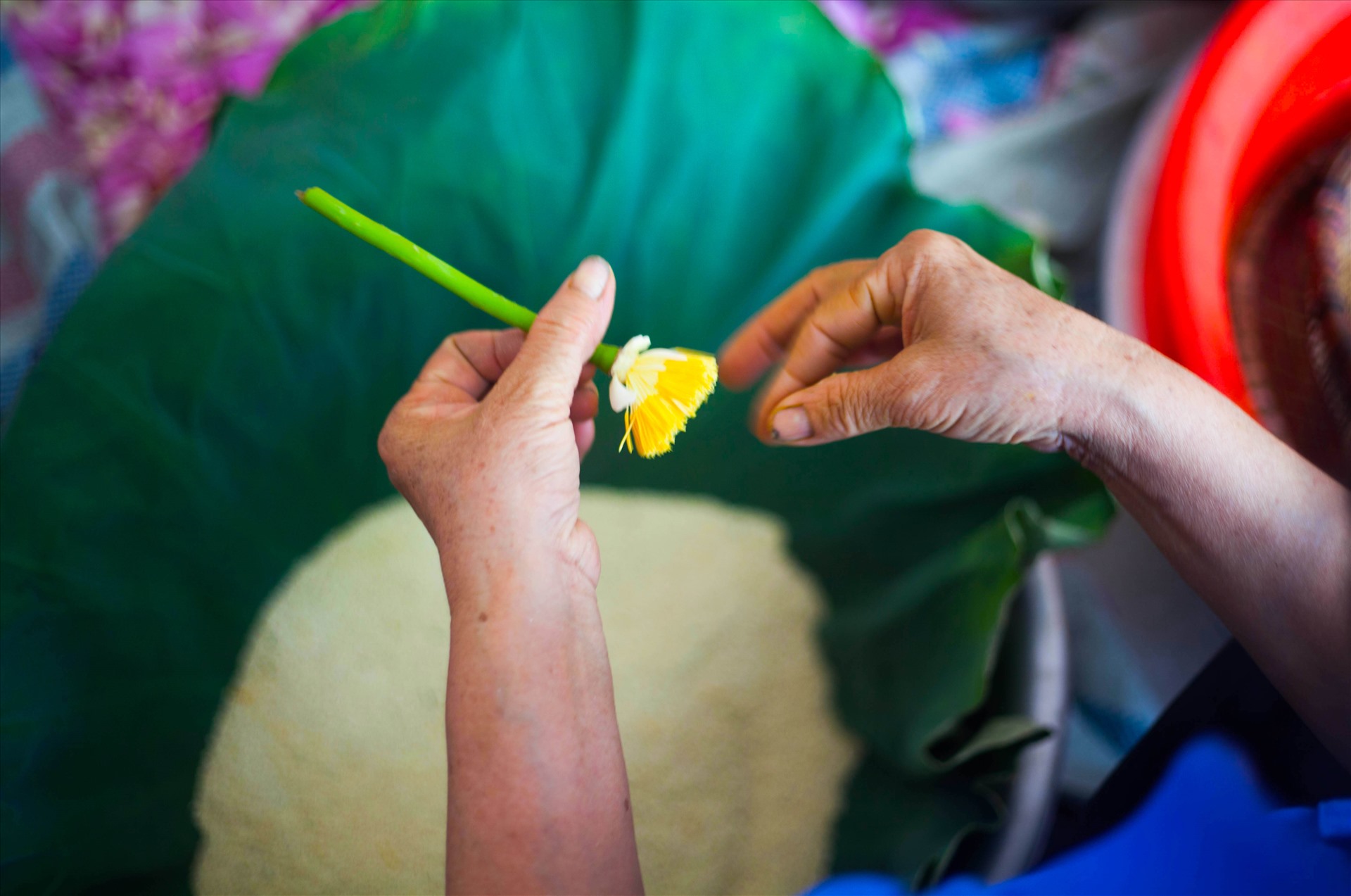 蓮茶作りに必要なのは、「ガオゼン」(gao sen) と呼ばれる雄(お)しべの先の葯(やく)の部分です。まずは、ビンクの美しい花びらを外し、黄色の蜂の巣型の部分と雄しべだけの状態にしてしまいます。次に雄しべの先の白いガオゼンを優しく指で撫(な)でながら、外して集めていきます。潰(つぶ)さないようにそっと優しく、しかし、香りが逃げないように手早くのは必要です。
