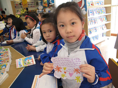 ホアイ ベトナムの英雄的なキムドン少年を冠にした出版社の展示ブースの前には東日本大震災の被災者に送るため、大きな手紙を作成し、この祭りに参加した人々から励ましの言葉と署名を集めました。ベトナムの多くの若者がその手紙に日本の被災者に対する心からの励ましの言葉を書き込みました。例えば、「日本の皆様、頑張ってください」とか、「私は皆様に感銘を受ける」とか、“ Be strong Japanなどですね。