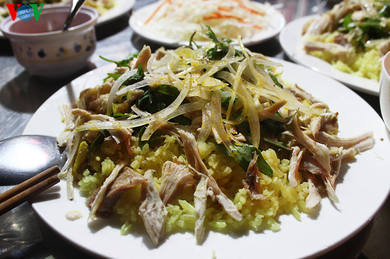 そして、ホイアンのもう一つの有名なストリートフードはコムガー(Com Ga)です。コムはご飯、ガーは鶏なので、チキンライスという意味です。これは鶏の炊き込みご飯で、鶏の出汁で炊いたご飯と鶏の身を一緒に頂く料理です。ハノイから来たレ・トさんは次のように話しました。