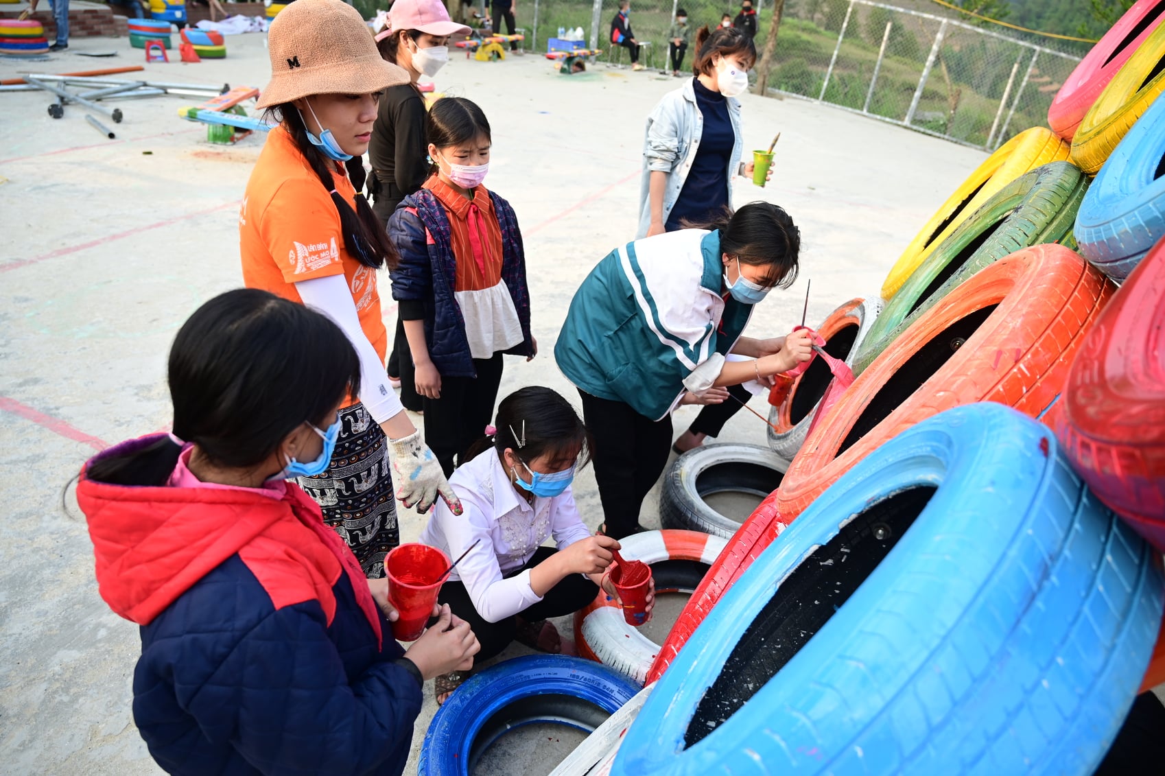 はじめての「溶け込みの遊び場」は今年の4月にハノイ市ハドン区ドンマイ地区にある第11居住地に設置されました。「夢を動かそう」というグループのボランティアの巧みな技術により、使用済みのタイヤや木材の板、ドラム缶などは色とりどりのシーソーや滑り台など安全な運動遊具となりました。