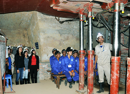 「石炭の採掘は、露天堀りと坑内掘りという2つの方法で行われています。露天掘りは、坑道を掘らずに地表から掘っていく手法です。坑内堀りは坑道を掘ってから、地下の石炭の層を採掘する方式です。技術の発達や作業の機械化、そして石炭の層が深くなっていることから、坑内掘りによる生産の割合が増加しています。クアンニン省には、地下300メートルの坑道を持つ炭鉱もあるんですよ。」