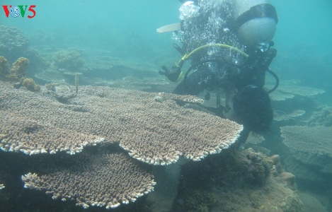 ホアイ 数年前、ニャチャン市の海洋学研究所はチャム島の生物保護区とニャチャン湾の生物保護区を対象に、石サンゴ苗の植え付けを行ってきました。