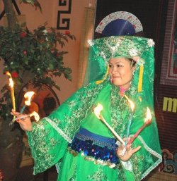 アン 地の神は黄色い象で、紙の象に願いを書いたものをつけて、それを燃やします。同じく、煙となった願い事が地の神に届けられます。水の神への願い事は白い船を紙で作り、同じようにします。山の神へは紙で作ったいかだに、同じく紙で作った12人の楽隊と二人の侍女を乗せます。