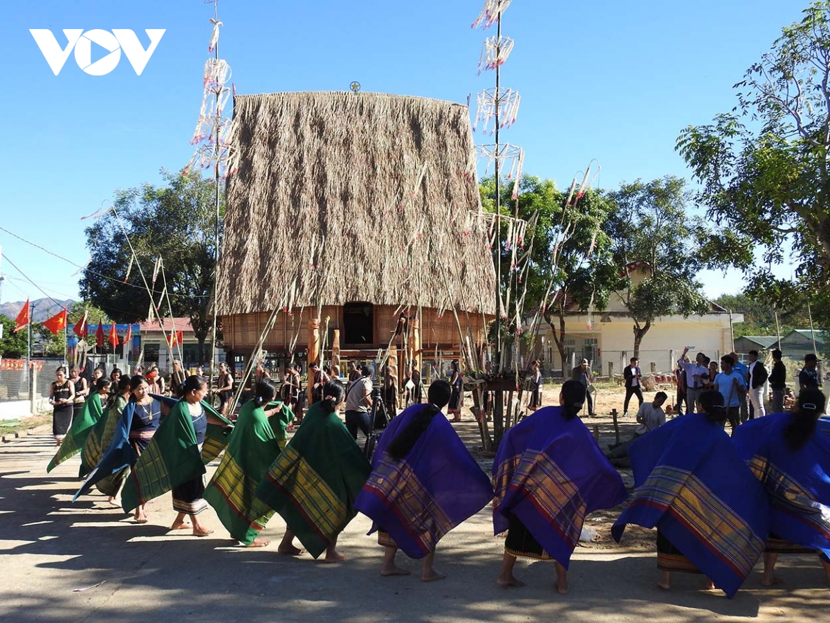 テイグェン地方で、乾季は祭りのシーズンです。コントウム省サーテイ県に住む老人の一人であるアテゥさんは高床式の合掌づくりの家の建設に関する多くのスキルを所有しています。アテゥさんによりますと、高床式の合掌づくりの家がなければ、村の祭りは楽しくありません。昨年、村の高床式の合掌づくりの家が復元され、村人は嬉しくなったそうです。高床式の合掌づくりの家は村の活動が行われる場所であるだけでなく、民族大団結精神と共同体の力を表すものであるとしています。アテゥさんは次のように語りました。