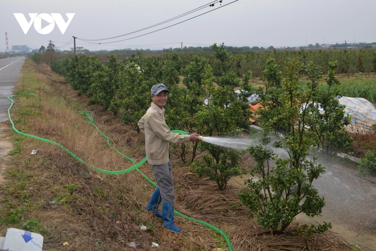クアンニン省ドンチエウ町ビンケー村ドンドー集落の花農家らは早朝から畑仕事に追われています。金柑、桃の花、ユリ、菊の各庭園では、農民たちは肥料を与えたり、水やりをしたり、枝を剪定したりするなど花の手入れに細心の注意を払っています。植物の生育に適した気候なので、テトの花が豊作となることを誰もが期待しています。