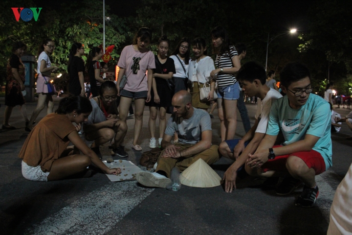 ハノイの歩行者天国でよく催されている昔ながらの遊びは、「ムア・サップ」の他、「オーアンクアン」、「ゴム飛び」、「大縄跳び」、「長引き」、「竹馬」などです。ゴム飛びや長引きなどは体力を求めますが、オーアンクアンは頭脳ゲームです。カルキ一本か煉瓦一個と大きな石、小さい石と小さな庭だけで面白くて楽しい遊び方です。盤は10個の小さな正方形(庶民のエリア)に分けられた長方形で両側はそれぞれが5つの正方形があります。盤の両端は半月の形(官僚のエリア)2つがあります。ゲームの終わりには庶民に換算されるチェスのこまを持っている人が勝ちです。かつて子供たちなら誰でも一回はやったことがある遊びですが、現在はできる子が少ないです。しかし、マイ・ハノイ・クラブの指導を受けて、多くの子どもたちがオーアンクアンを楽しむことができるようになりました。