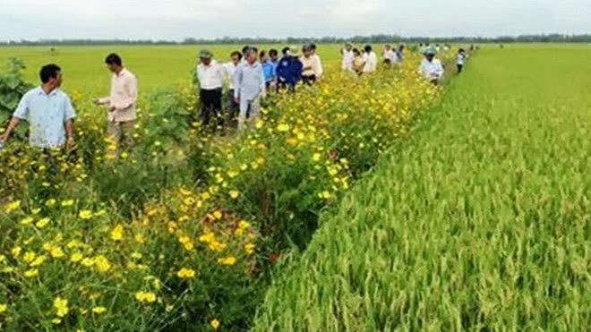 「田んぼのあぜに花を植えるモデルは南部メコンデルタ地域で繰り広げられています。これは良い生態環境づくりや稲の害虫の予防、農薬の使用中止、製品の質的向上に寄与するものです。」