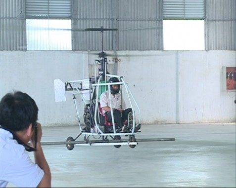 このヘリはざっと見て、かなり不思議な型をしています。この飛行機は主翼、胴体、エンジン、プロペラなどから構成されていますが、注目すべき場所はパイロットの椅子です。それは、道端の茶店でよく見かける赤いプラスチックのあの椅子なのです。この椅子はプロペラモータの前に付いています。多くの見学者の前で、ヒエンさんは倉庫の中でヘルメットを被り、ヘリの中に入って座り、やがて飛行しました。