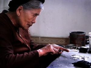 キェウ・キ村に来ると、箔打ちの音が聞こえてきます。そこでは、老人から子供たちまで誰もが金箔の製造工程に参加しています。同村の高齢の職人によりますと、キェウ・キ村の金箔産業は300年まえから始まったと言えます。当時、1740年から1789年までのレ・カン・フン王朝時代には、博士号をとったハイズォン省出身のグェン・クイ・チさんは外国からの金箔の職を学んで、住民たちに伝来してきました。キェウ・キ村の人々はチさんの恩に報いるため、彼を金箔産業の創業者と呼んできました。職人のレ・バン・ボンさん(LEVANBONG)は次のように語っています。