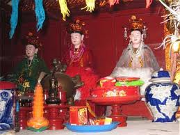 昔の人々の言い伝えによりますと、宇宙は「天」「地」「水」という3つに分けられています。「天」は天国を現す赤、「地」は地球を現す黄色、「水」は海洋を現す白です。ベトナムの大多数の寺院の中には「女神様」を祀る神殿があります。そのほか、寺院、神社の中に、「魂呼び」という独特な儀式もよく行われています。