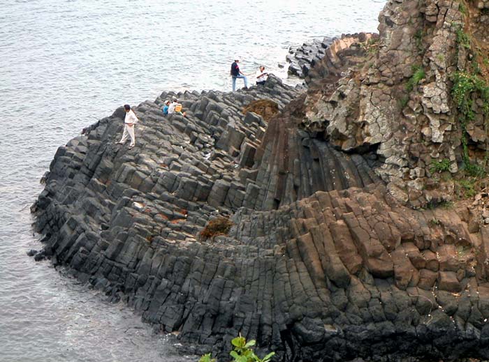 第一印象は、海へ向かって立つ巨大な岩礁がきちんと刻まれた沢山の岩柱のように見えることです。それらの柱の断面は六角形、あるいは円柱型をしています。数万もの岩柱は数万もの皿が重なったように丸い石が、60から80センチぐらいの高さになっています。遠くから見るとまるで、巨大な蜂の巣のように折り重なっています。