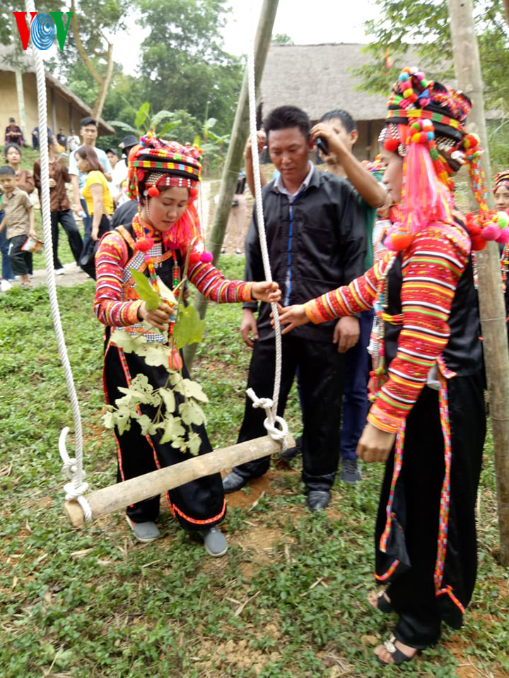高さが6、7メートルのこのブランコは村の若者たちによって設置されますが、設置後、イラクサ科のカラムシの枝がブランコの上に置かれ、ブランコを祭る儀式が行われます。この儀式が行わなければ、ブランコを遊んではいけません。これらについてライチヤウ省芸術センターのヴ・フォン・タオさんは次のように話しました。