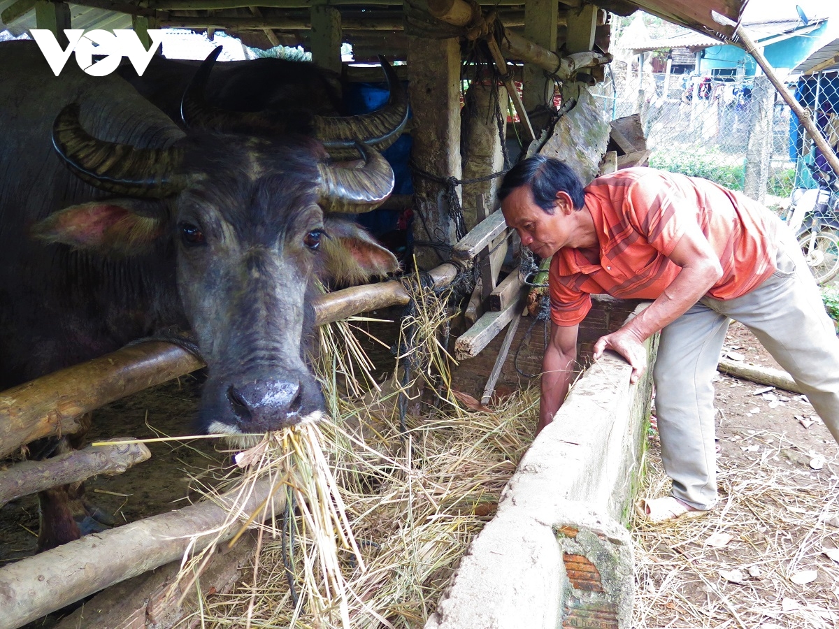 バト県ランザイ村に住むファム・ヴァン・カイさんは、2016年国から水牛を補助して、牛舎の建て方や草の植え方、水牛の世話など水牛の飼育技術を教えてもらいました。その5年後、彼は国からもらった水牛から7頭の水牛を持てるようになったほか、十数頭の肉用の水牛を売りました。カイさんは、村の多くの世帯は肉用の水牛飼育により、貧困状態から抜け出したと述べ、次のように語りました。 (テープ)