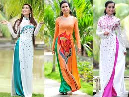 「アオ・トゥ・タンは4枚身頃からなります。後ろ身頃の真ん中にスリットが入り、2枚に分かれますが、前身頃の2枚は幅の広い色とりどりの何本もの布で結ばれ、女性を美しく見えます。Vネックのブラウス(Yem)や平らな形の帽子(Non quai thao)がアオ・トゥ・タンとセットになります。今も、ベトナムの民謡クァン・ホの歌い手はこのような民族服を着用しています。」