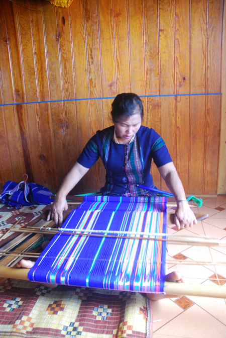 クホ族の織り機は木と竹でできますが、仕組みは簡単で、使わない時は分解してコンパクトにできます。布の色は白と黒がベースとなり、一番多いですが、模様の色は青と赤が一般的です。模様のほとんどは、小さい三角とひし形で、布に地味な美しさを与えます。少数民族文化の研究者グエン・カイン・ナムさんは次のように話しています。