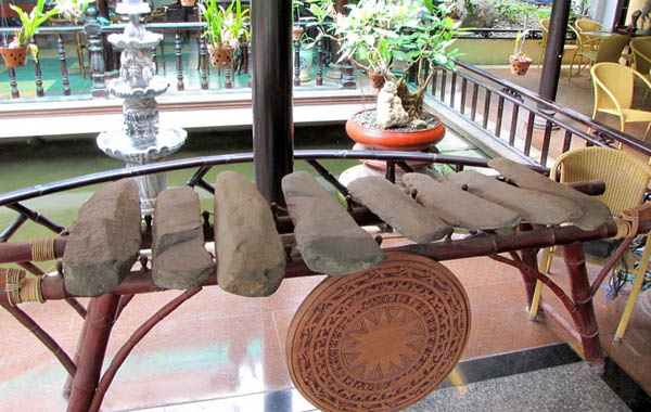 クホ族の「ダン・ダ」は、3本、6本、9本からなるものが一般的です。クホ族の人はいい音が出る石を選んで、削ったり磨いたりして形の順に並べます。こうした素朴な石でできたダン・ダは大自然の音を出す楽器として有名です。ダン・ダの演奏者クザンさんは次のように話しています。