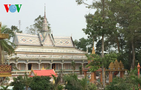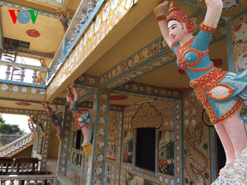 クメール族のお寺は、ベトナムにある他の民族のお寺とかなり違う建築の特徴があります。クメール族のお寺は堂々とした建物で、細密で派手な彫刻が巧みに刻まれます。これらの彫刻は、4つの顔を持つバヨンという神様やクルドという神の鳥など、この民族の昔の多神教から生まれたものが多いですが、仏教とも調和がとれています。ベトナム美術協会の会員リー・レットさんは次のように話しました。