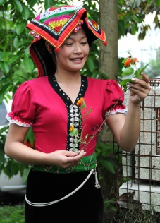 「今日の衣装は大きく改良されてきました。昔のタイ族は自分で織って、染めた藍色のスカートを着ましたが、今はベルベットなどのスカートを来ています。タイ族の長い服は2種類あります。一つは両脇に模様が付いていて、お年寄りが着用するものですが、もう一つは体にピッタリとしたシャツであり、前身頃に模様がついています。これは若い女性がよく着ています。」