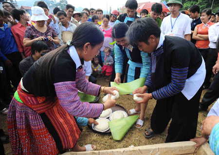 旧正月テトが来ると、モン族の集落ではどの家庭もバインザイを作ります。大晦日の前日、家々はおコワを炊き、大晦日の朝、バインザイをつくります。また、午後はモン族の独特の正月テトガー(Tet ga)を祝います。バインザイができるまでまる一日かかります。ザン・ティ・キアさんは次のように明らかにしました。