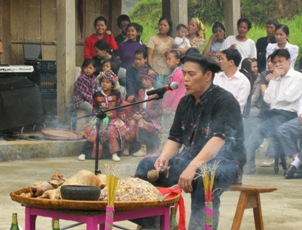 「雨 乞い祭りは、家ではなく、畑で行わなければなりません。その時、村人は全員そろっていなければなりません。そして、民族衣装を着ていなければなりません。お供えは鶏、犬、おこわ、線 香などです。祈祷師は四方にいる4人の神様のほか、最初のカップルに拝みます。このカップルは人間を創ったので、このカップルに祈らなければ、だ めです。」