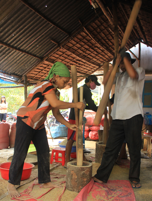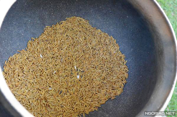 美味しいコムを作るには、まずちょうどいいもち米を選ぶことが大事です。熟しすぎても若すぎでもダメなのです。そのもち米を数分間水に浸けておきます。次は、土でできた鍋に入れて、いい香りが出るまで中火で炒ります。その後、 臼にれて杵でついて籾殻を除きます。