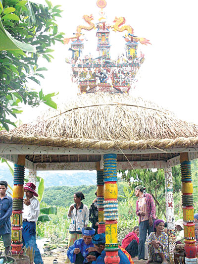 ボマ儀式を行なうためには数ヶ月の準備が必要です。先ずは、ニャーモー(nha mo)と呼ばれるお墓の家を建てることです。ニャーモーはお墓を覆う家で、儀式はこの家の周りで行なわれます。ニャーモーの屋根の上にはカゴー(Kagor)と呼ばれる木製の船が置かれます。鳥や動物の模様が刻まれたこの船は死者の財産の現れであり、死者への生きている人のプレゼントでもあります。また、祭壇では、死者の写真の上に甕があります。この甕は死者の魂が住む所であると考えられます。ラグライ族の一人マウ・スアン・ザインさんは次のように語りました。