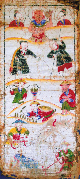 「礼拝用の絵の中には、天国、水中の世界、下界のすべてを描く絵もあります。玉皇上帝を招待するためには、天国のような世界を描かなければなりません。仏様を祀るためには、仏教の世界を描く絵が重要です。水中の世界には竜の神様がいます。つまり、神にお越しいただけるように、その神様に見合うような神聖な環境を作り出さなければなりません。この考えはどの民族も持っていると思います。」