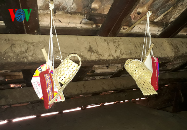 儀式の前に、母方の祖母が抱っこひもを、母方の祖父が竹製の揺り籠を作るという役割分担です。抱っこひもは錦織で作られ、多くの派手な模様が刺繍されます。その一方で、父方の祖父は、幅5センチ、長さ15センチぐらいの小さな竹製の籠を作ります。家の中の屋根にかけられるこの籠はその赤ちゃんの魂の象徴として上から赤ちゃんを守るという役目があります。女の子向けの籠は男の子向けの籠より作り方が簡単で、そして、籠に一緒にかけられる飾り物も男女によって違います。そのため、タイ族の家に入って屋根にかけられている籠を観ると、その家族の人数と性別がわかります。